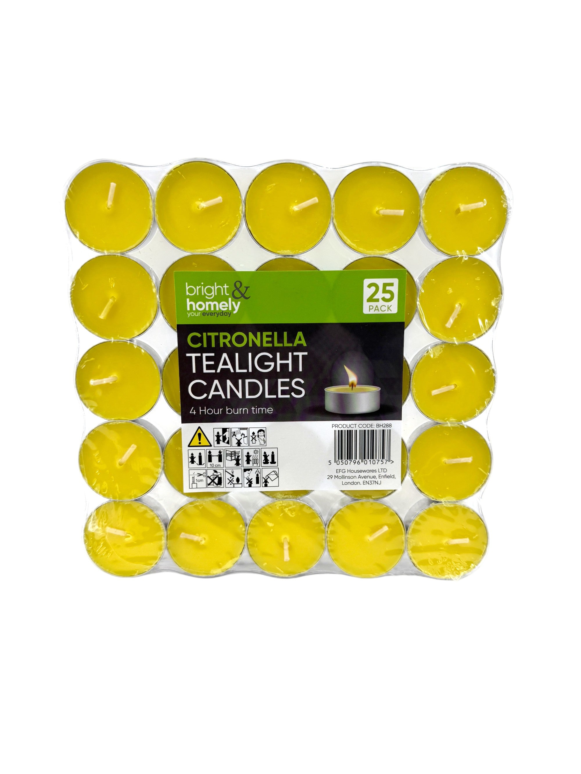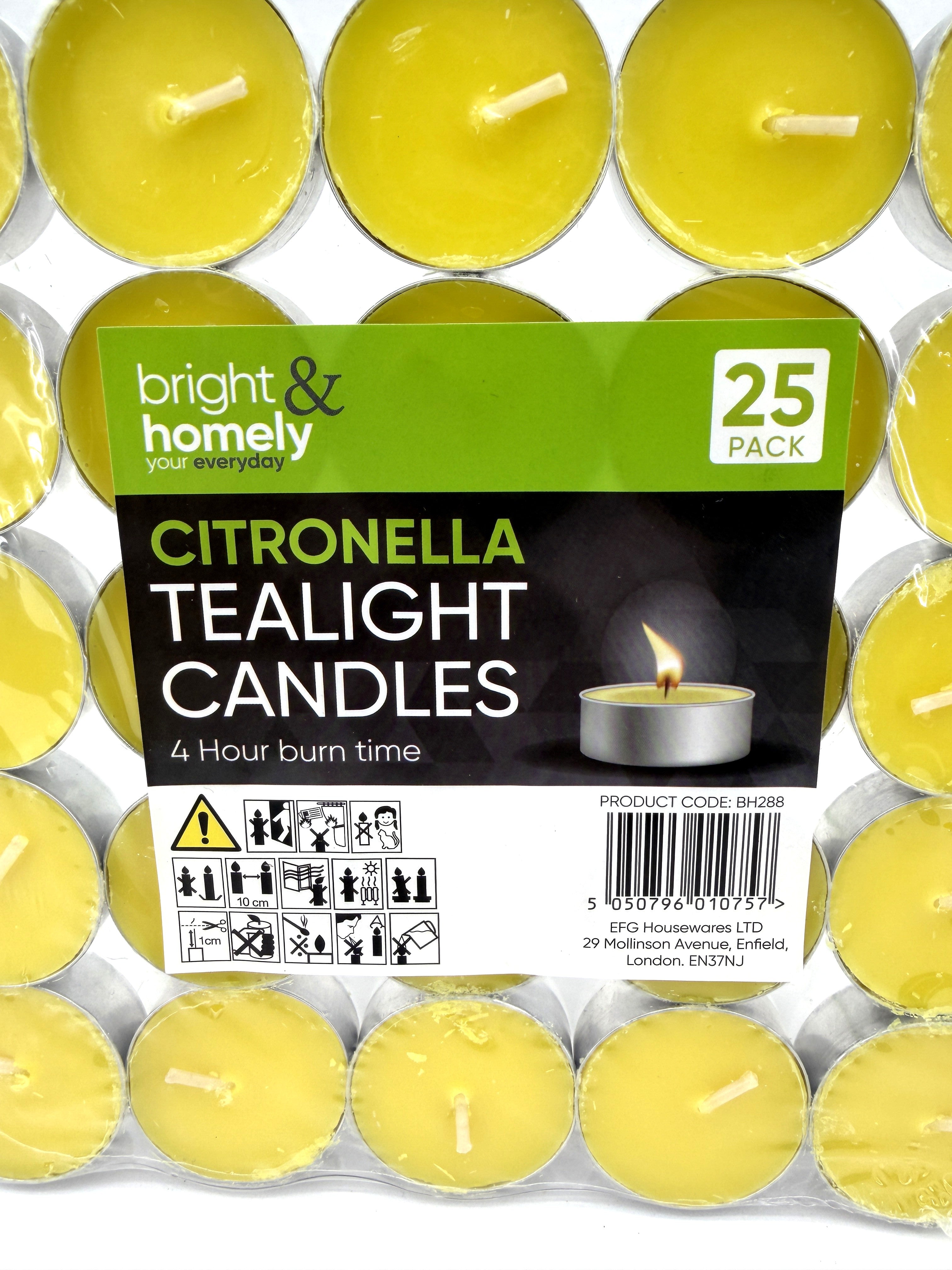 Enjoy outdoor living with our effective pack of 25 citronella tealights, featuring natural citronella oil that helps repel mosquitoes and flying insects while creating a pleasant outdoor atmosphere. These high-quality tea light candles burn for up to 4 hours each, providing long-lasting protection and ambient lighting for your garden, patio, or outdoor gatherings. Each tealight burns cleanly and evenly, releasing the natural citronella fragrance that insects dislike while humans find refreshing.
