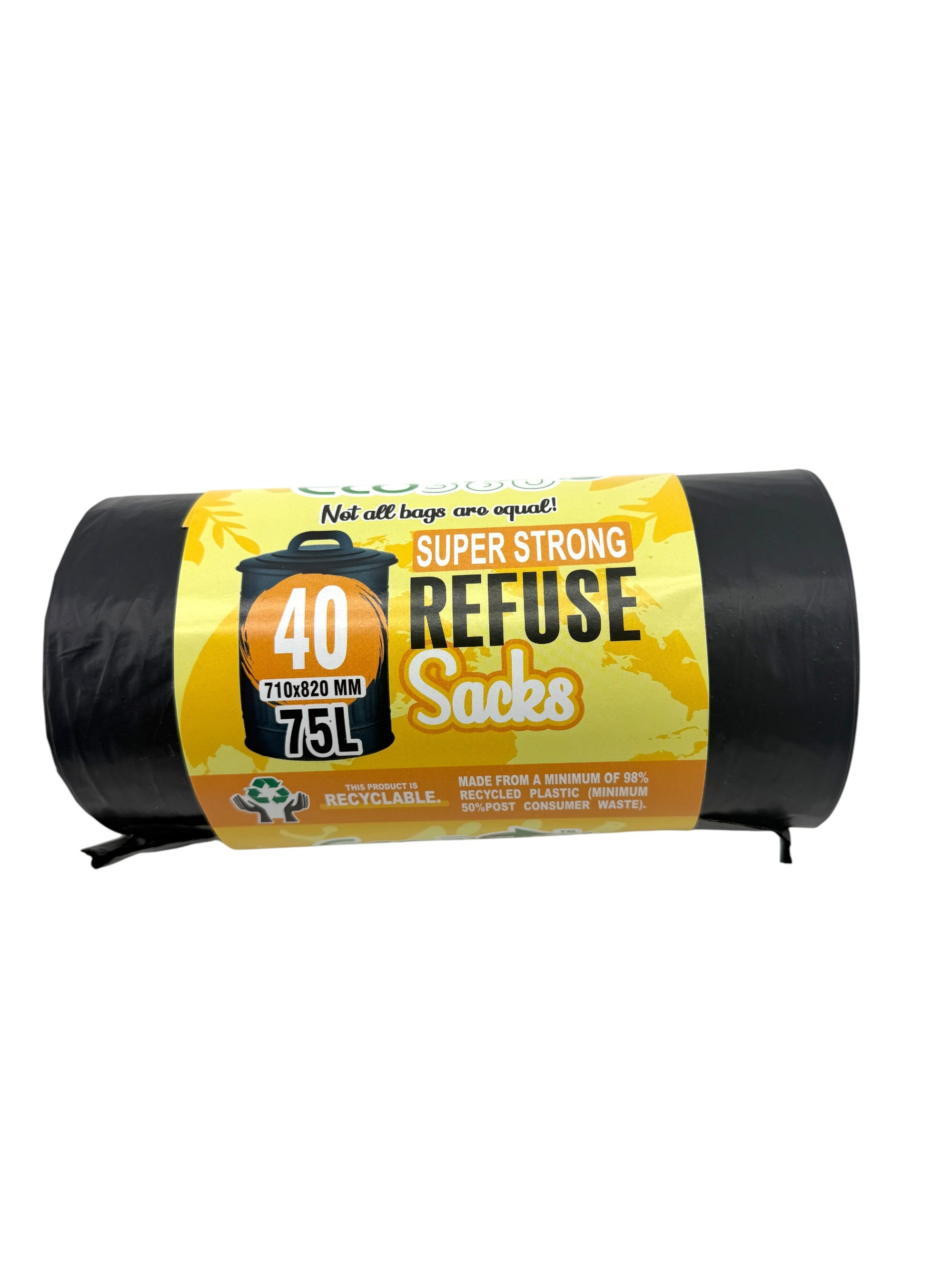 Manage your household and commercial waste efficiently with our pack of 40 super-strong refuse sacks, designed for reliable performance and environmental responsibility. These robust 75-litre bin bags measure 710x820mm and are made from a minimum of 98% recycled plastic, offering exceptional strength while supporting sustainable waste management. Each bag features reinforced construction that handles heavy loads and prevents tears, making them perfect for both domestic and commercial use.