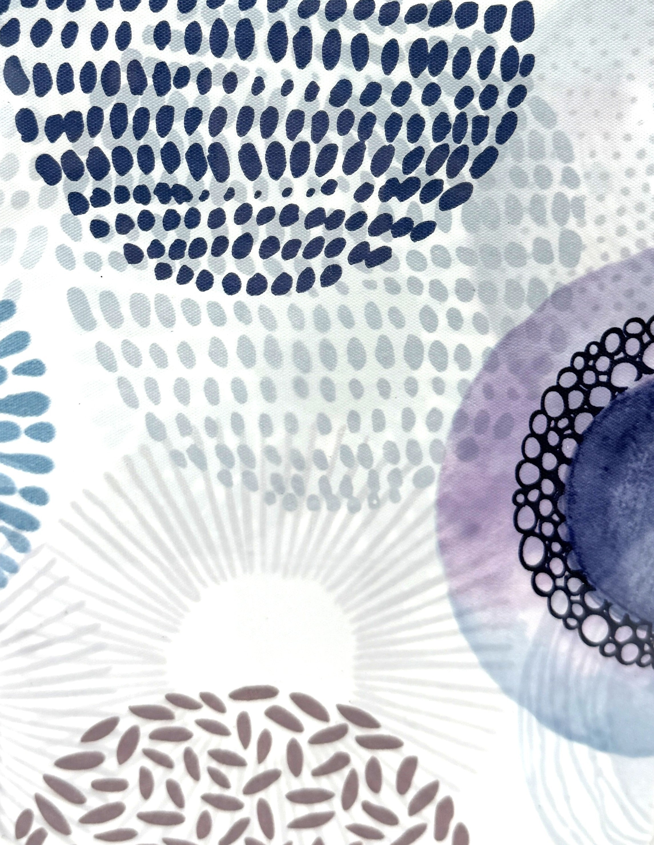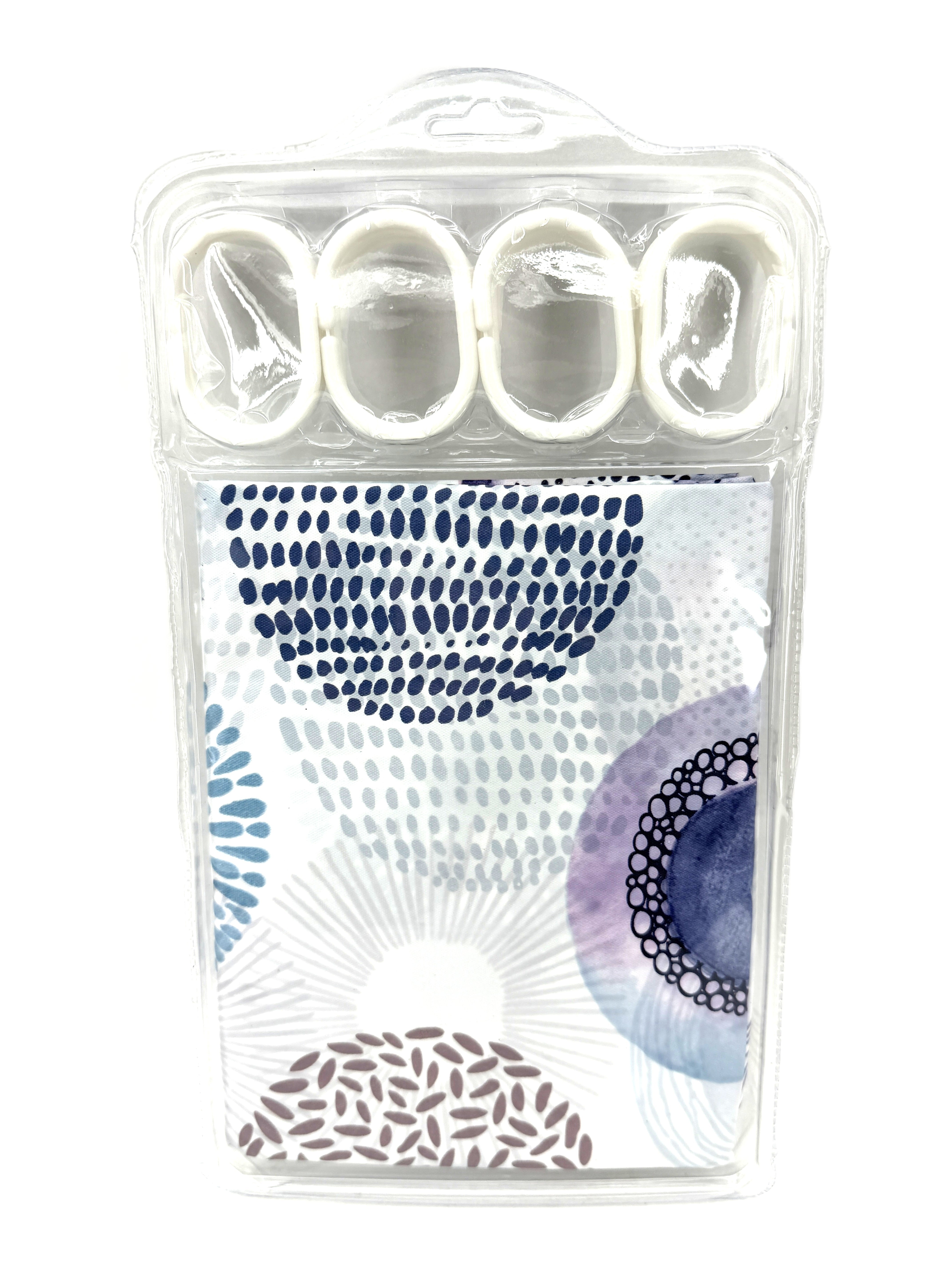 Elevate your bathroom's style with the "Adorn Modern Dot Pattern Shower Curtain Set." This eye-catching curtain features a contemporary, abstract design with vibrant purple, blue, and teal circular patterns, bringing a splash of modern artistry to your space.