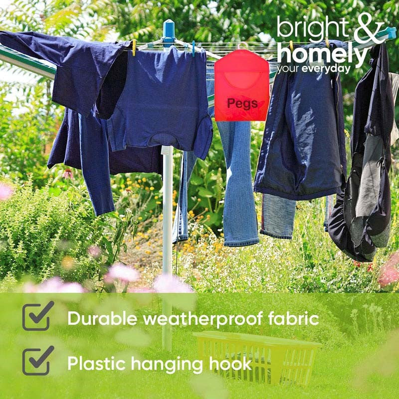 Keep your clothes pegs organised and protected with the Bright & Homely Weatherproof Peg Bag from Kumperi. Available in vibrant colours, these durable fabric bags feature weatherproof construction and convenient hanging hooks for outdoor laundry organisation.