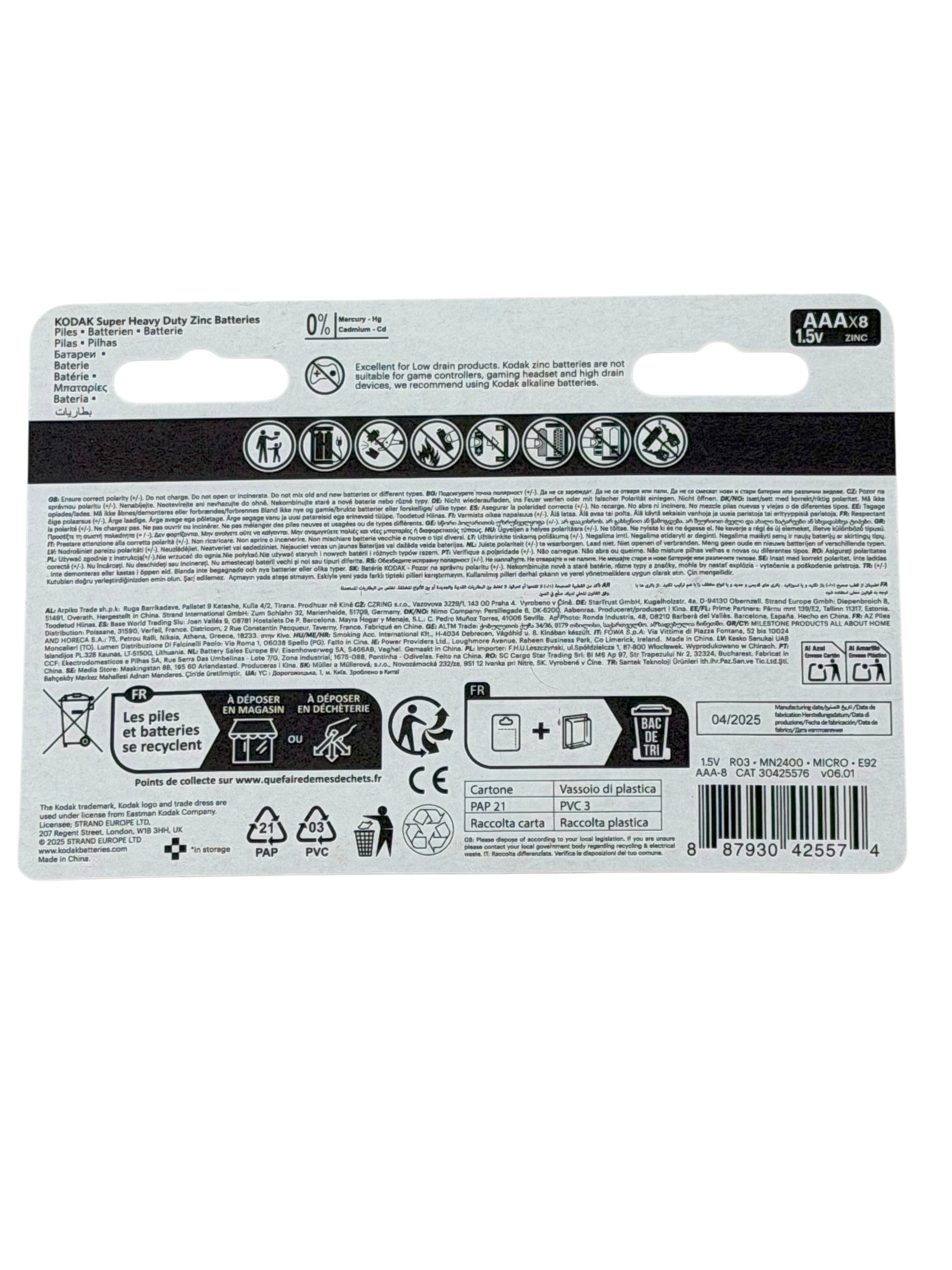 - Pack of 8 AAA Super Heavy Duty Zinc batteries