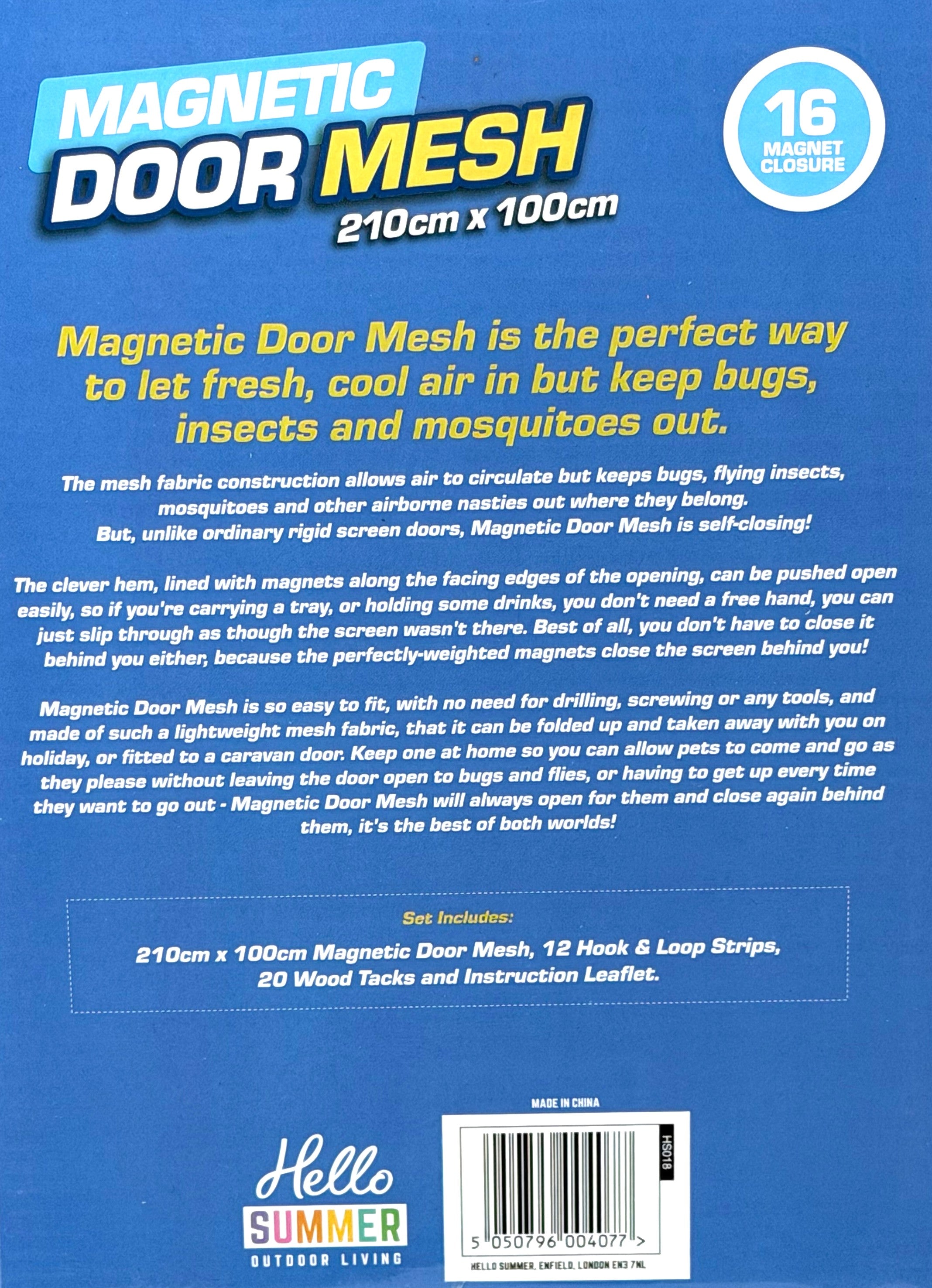 210cm x 100cm Magnetic Door Mesh, 12 Hook & Loop Strips, 20 Wood Tacks, and Instruction Leaflet.