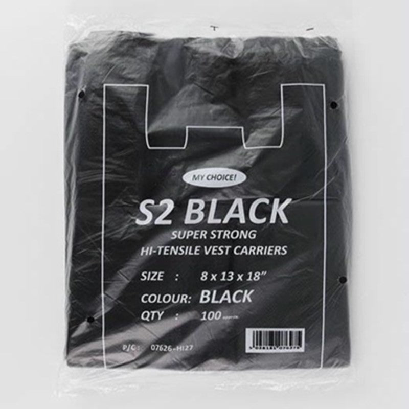 Stock up on reliable carrying solutions with My Choice S2 Black Super Strong Hi-Tensile Vest Carriers from Kumperi. These premium black plastic bags offer exceptional strength and durability for retail, commercial, and personal use with convenient vest-style handles.