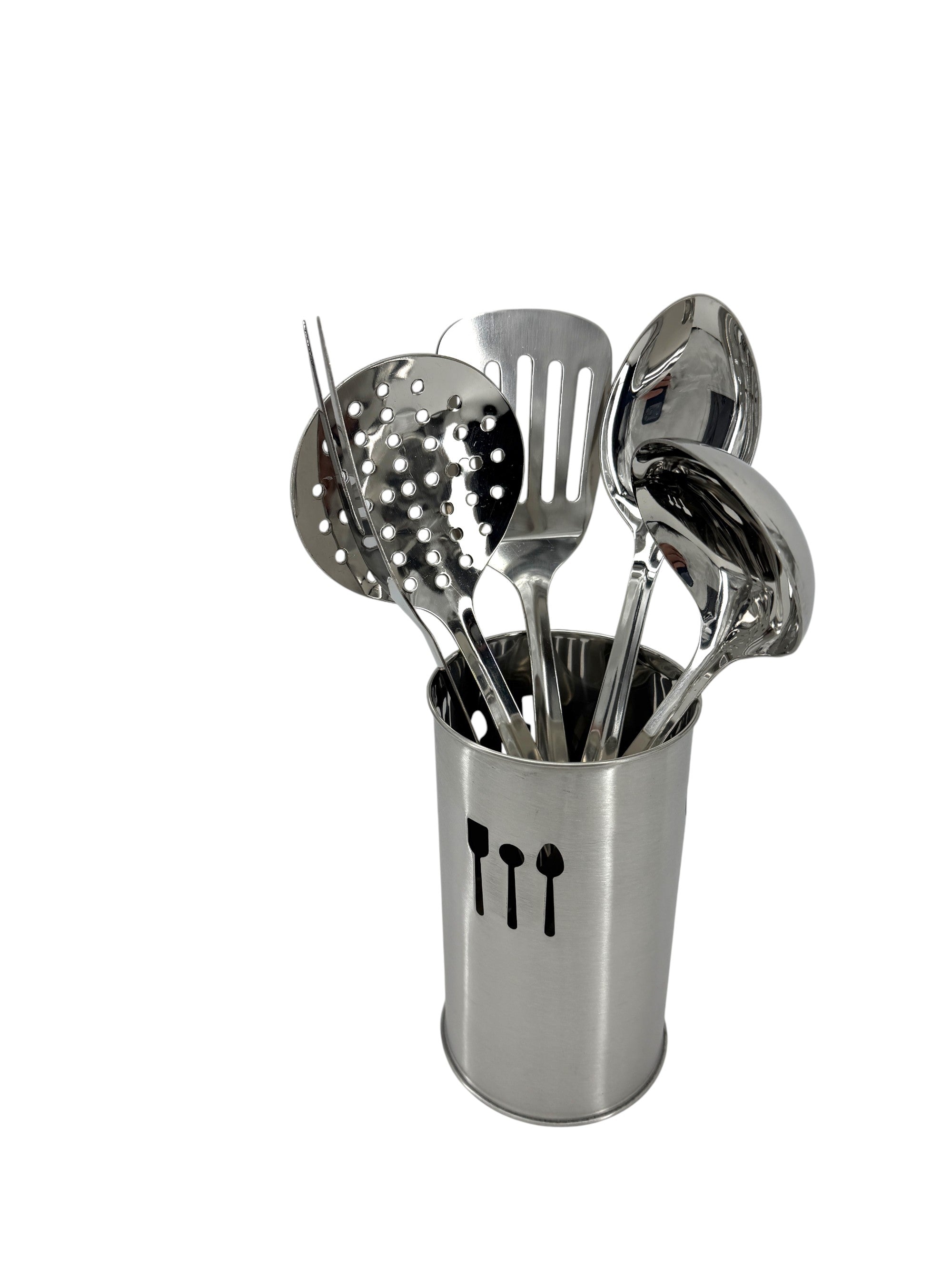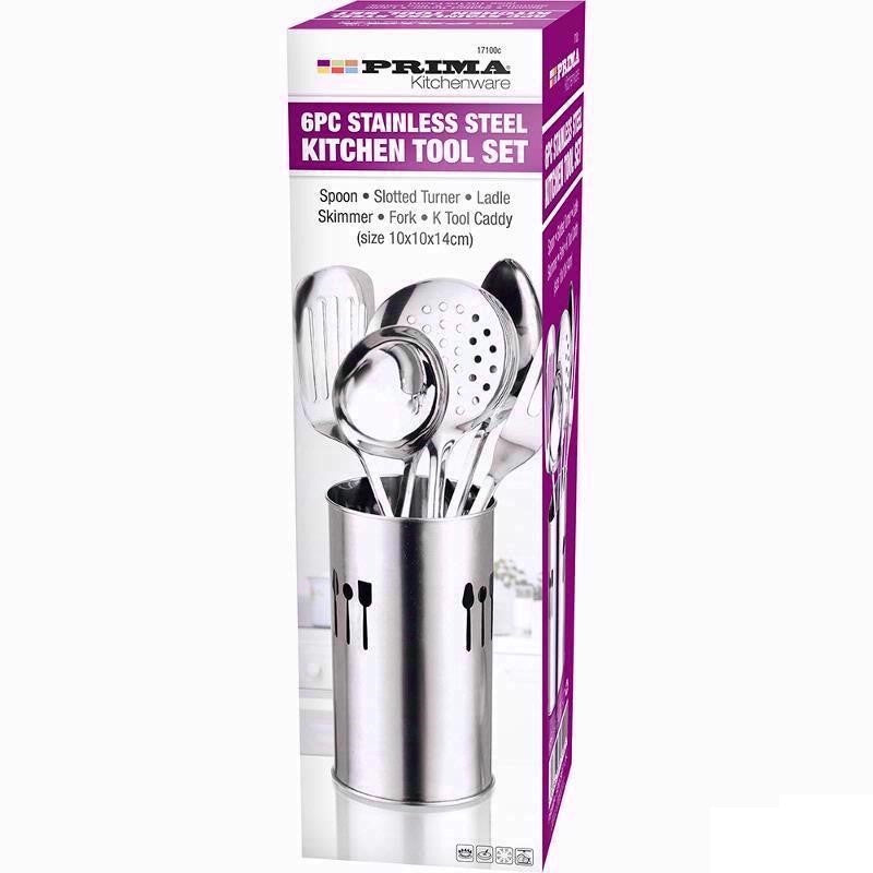 Elevate everyday cooking with the Prima Kitchenware 6‑Piece Stainless Steel Kitchen Tool Set from Kumperi. Crafted from durable, food‑grade stainless steel, this complete utensil bundle keeps your most‑used tools neatly organised in a ventilated countertop caddy. The set includes a spoon, slotted turner, ladle, skimmer, carving/serving fork, and a matching stainless steel tool caddy (approx. 10×10×18 cm). Rust‑resistant and easy to clean, each piece offers balanced weight, smooth edges, and heat‑safe practicality for frying, stirring, draining, serving, and ladling. Perfect for new kitchens, upgrades, student homes, rentals, and gift sets.